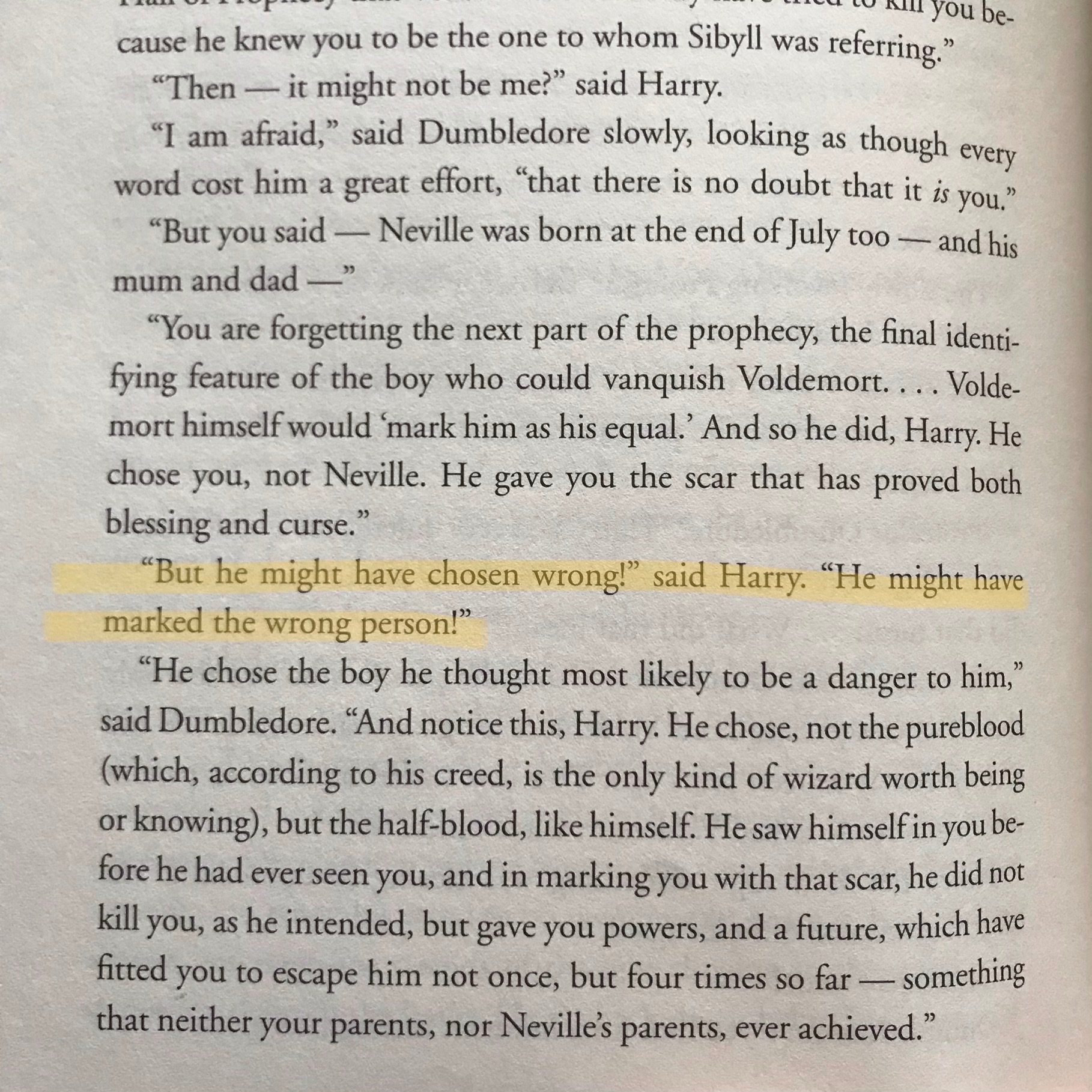 Dumbledore explains that the details given in the prophecy applied to Harry, but they also applied to Neville. It’s the moment when Harry finally understands what being the Chosen One will eventually mean.