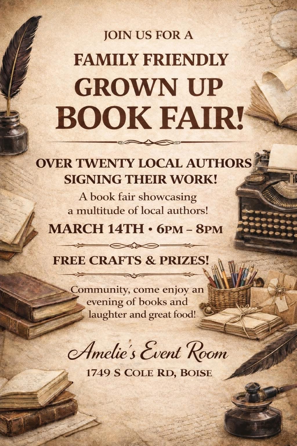 I will be selling and signing books at a family-friendly grown up book fair that is happening on March 14th at Amelie’s Event Room (attached to Amelie’s restaurant) in Boise. Hopefully a few of you live close enough to come see me!
