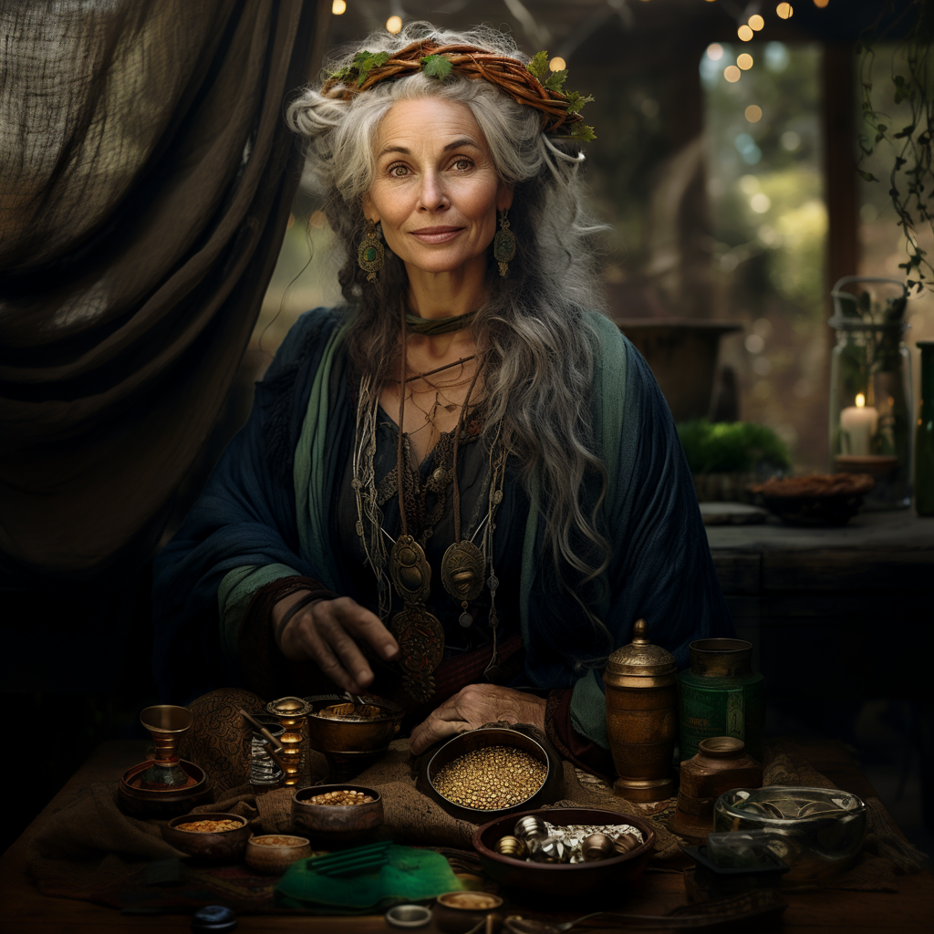 You bump into a few people as you stumble over to her, not sure what else to do. When you reach her little table, which is strewn with trinkets and bowls of spices, she leans over it to grab your hand.